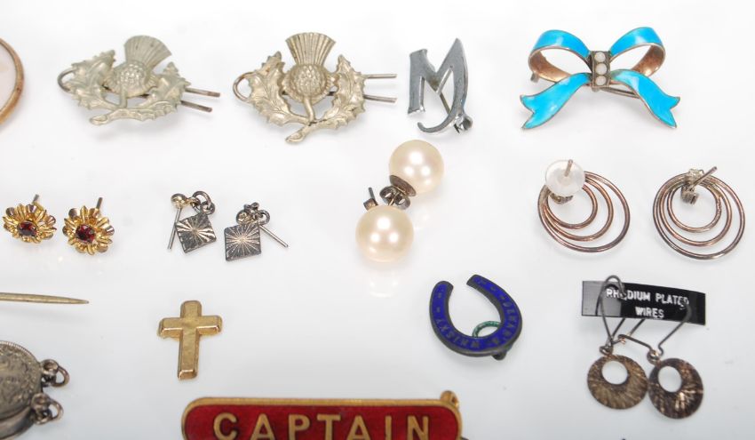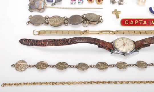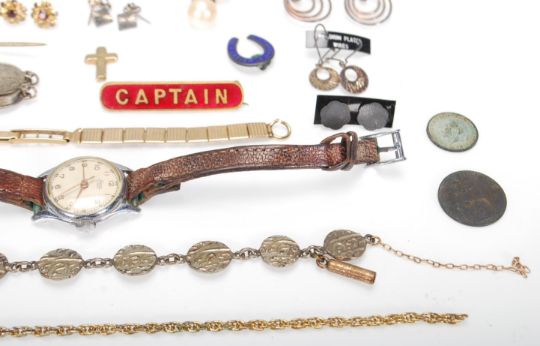 A collection of vintage ladies costume jewellery to include pairs of earrings some being silver, mourning brooches, silver threepence bracelet, a Sanco ladies wristwatch etc.