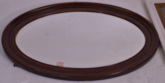 A vintage 20th Century white painted pine framed mirror of rectangular form having an inner giltwood border with a central beveled edge mirror panel. To both sided are oval pictorial plates. Together with a mahogany framed oval mirror having a beveled edge mirror panel. Plaque to verso for Phillips of Bristol. Biggest measures 57 cm tall by 82 cm wide.