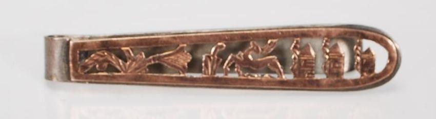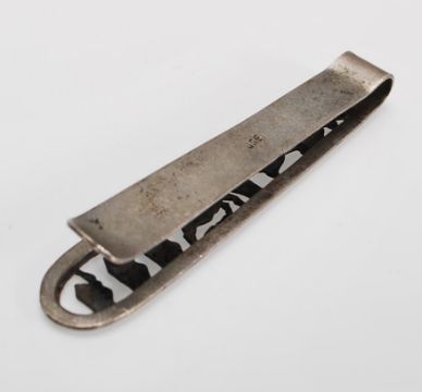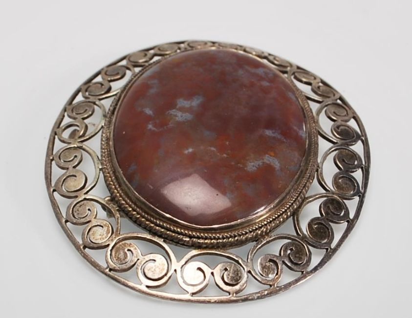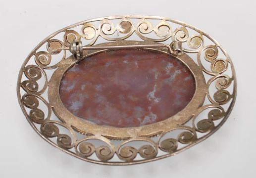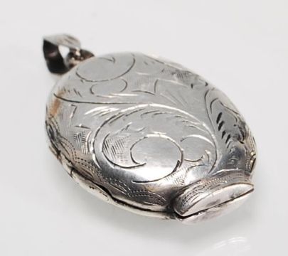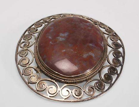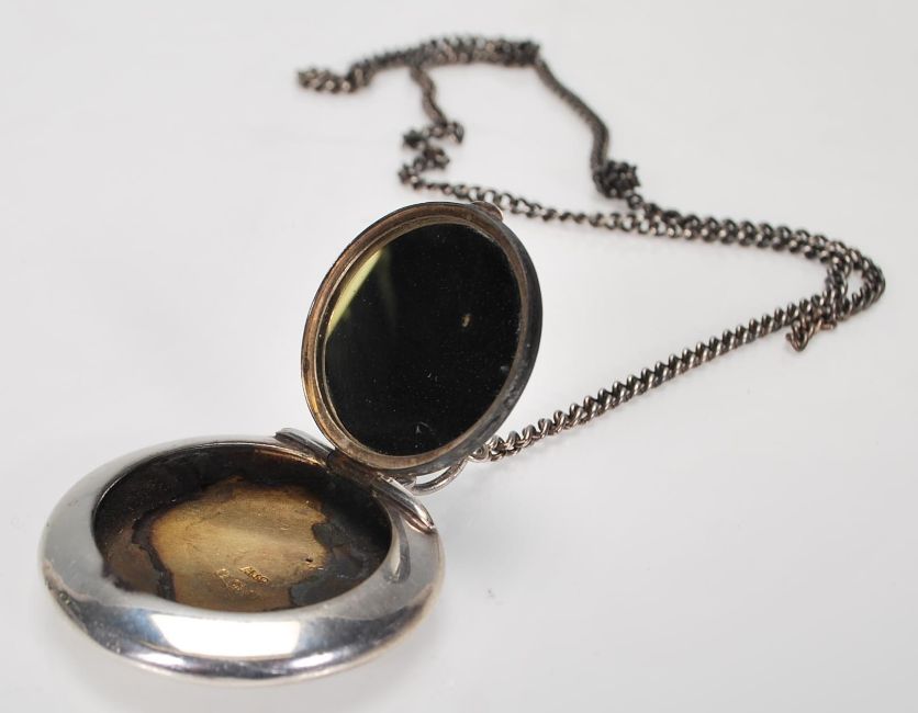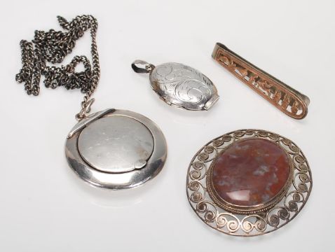 A selection of silver jewellery to include a stamped 900 silver tie clip having pierced decoration, a locket of oval form engraved with scrolled foliate decoration, a silver hallmarked compact pendant with a mirror to the inside and a silver white metal brooch set with an agate panel.