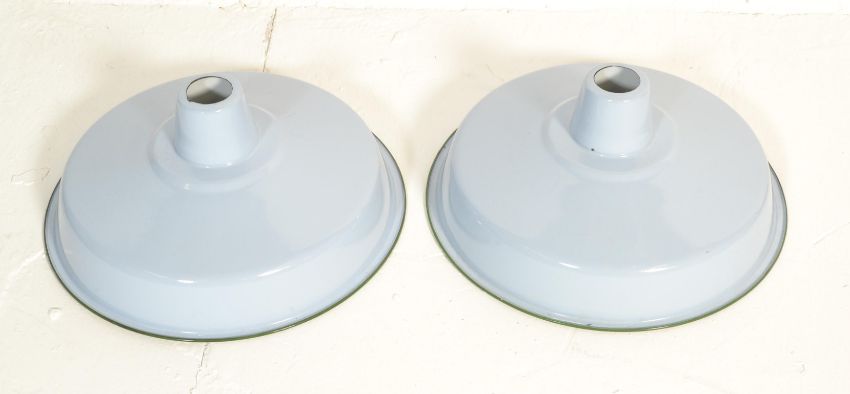 A set of four UFO enamel industrial ceiling lamp / light shades one finished in green with three in a light blue colourway. All having white enamel underside. Measures 42 cm wide.