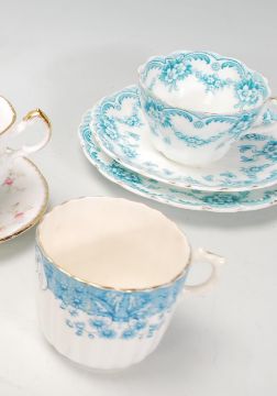 A mixed group of coffee cans / cups and saucers dating from the early 20th Century to include A Paragon Victoriana Rose pattern part coffee service, comprising of six cans and saucers and a lidded sugar bowl, a Shelly style flared rim tea trio, other blue and white cup and saucers etc.