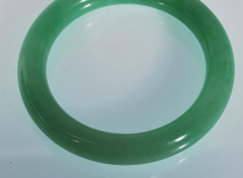 A 20th Century Chinese green jade bangle of round form. Interior diameter 5.5 cm. Measures 7.5 cm x 8 cm.