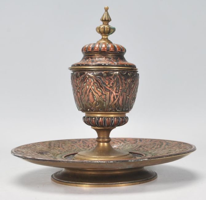 A 19th Century Islamic taste antique copper and brass inkwell having applied copper decoration with repousse and chasing patterns and brass finial atop the cover. The circular tray of matching form and design. Measures 16 cm tall.