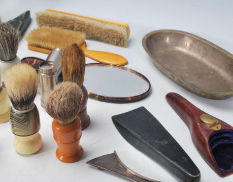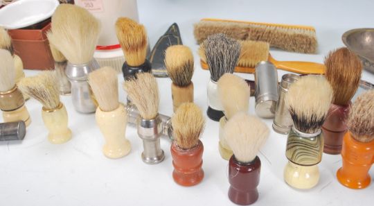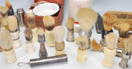 A good collection of vintage 20th Century shaving brushes and other related items to include multiple silverplated examples, painted brushes, a large advertising brush for Culmak Senior, leather cases brush pot, faux tortoiseshell handheld mirror, leather razor cases, early plastic examples etc. Some bearing makers marks to include Strong Set, Sterilized, Eterna, Dubl Duck and more.