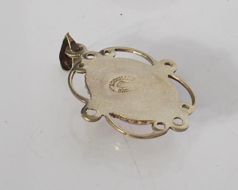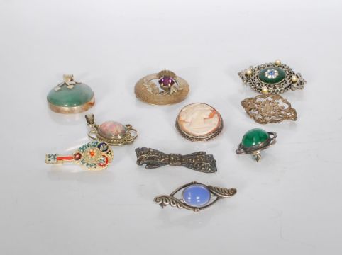 A selection of vintage 20th Century brooches to include a silver hallmarked Ward Brothers Scottish thistle brooch set with a round cut purple stone (hallmarked Glasgow 1951), an Italian micro mosaic guitar brooch, an Art Deco marcasite bow brooch, a silver pendant set with a green stone panel, a cameo brooch, a silver brooch with pierced decoration etc.