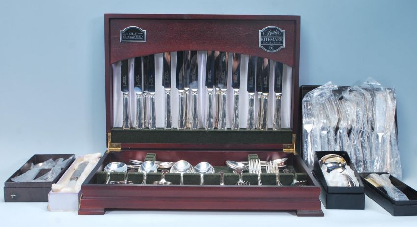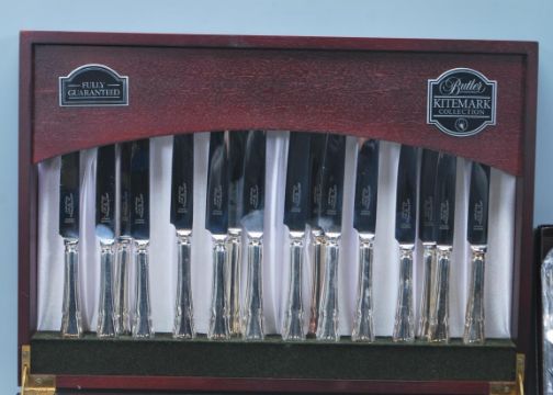 A 20th Century mahogany cased silver plated Butler of Sheffield Kitemark Collection eight persons service canteen of cutlery together with boxed silver plated table service accessories.