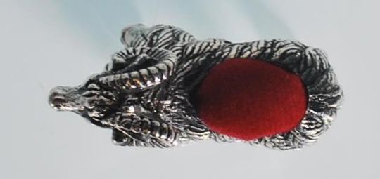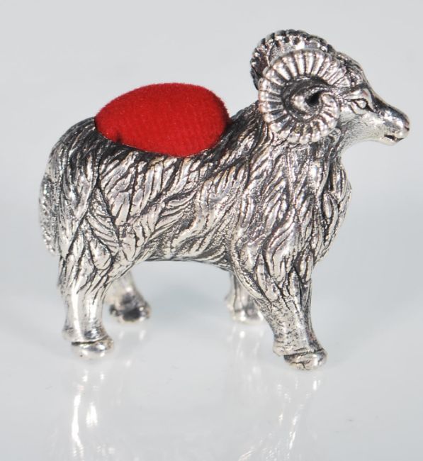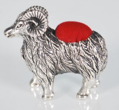 A small sterling silver pin cushion in the form of a ram. Measures: 3.4 x 4.3 x 1.2. Weight: 14.6g.