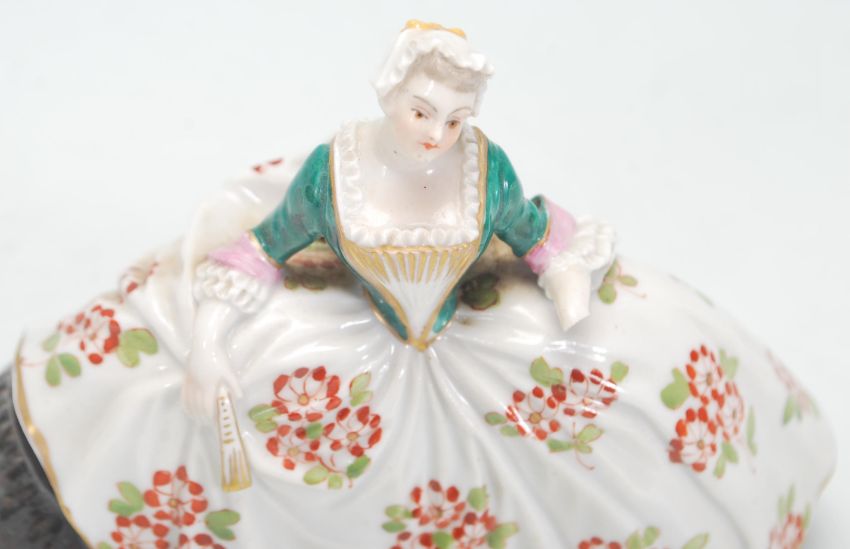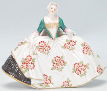 A rare 19th Century German antique Ludwigsburg porcelain bell in the form of a woman having a hand painted floral dress with a green corset and gilt detailing throughout. Metal bell clapper to inner with double blue C marks for Ludwigsburg. Sadly missing one hand. Measures 11 cm tall by 13 cm.