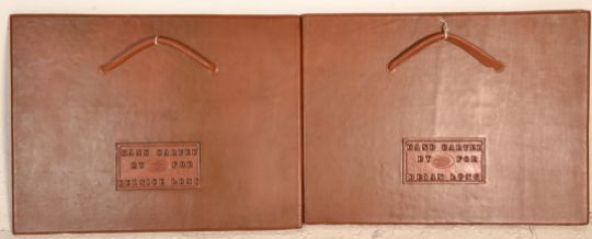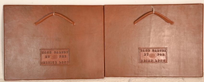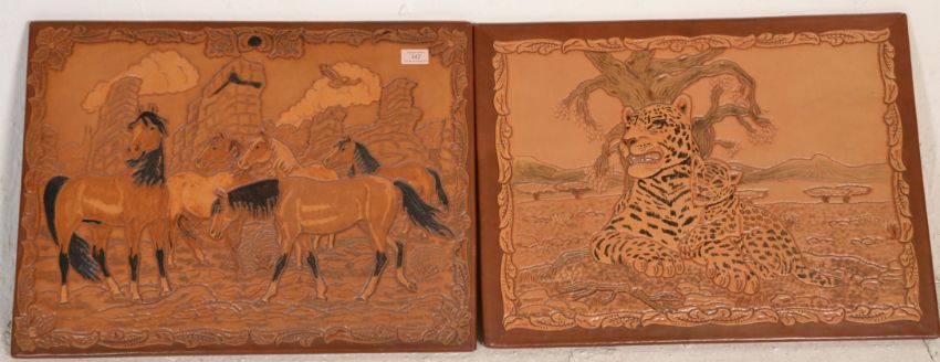 A pair of leather art wall panel pictures by Tony Browne to include one depicting galloping  horses and the other depicting a leopard. Plaque to the back marked Tony Long. Measures 50 cm  x  62 cm.
