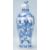 A 19th Century Chinese lidded vase of baluster form having a hand painted blue and white prunus pattern ground, with panels to either side painted with the eight immortal scholars pattern, having a flared lid to the top with a foo dog finial. The vase having four character marks to the base. AF. Measures: 26cm high x 11cm diameter.