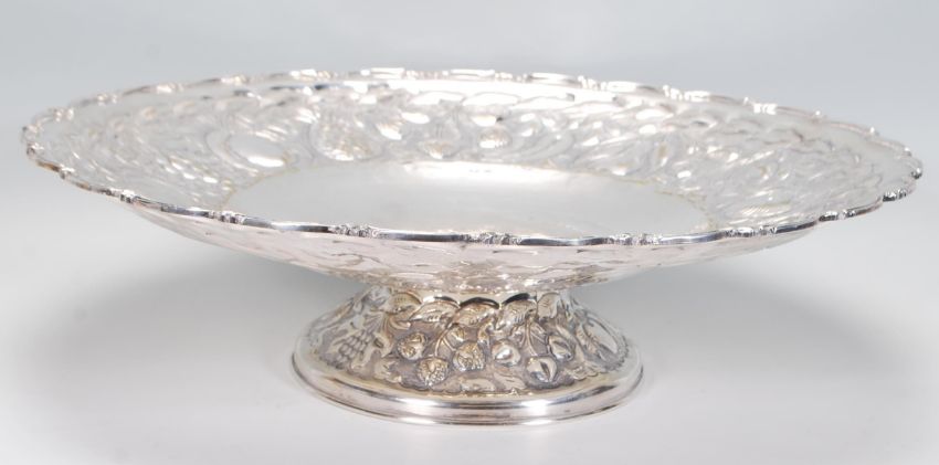 A large early 20th Century silver plate centrepiece tazza having repousse fruit and floral decoration with hand beaten decorated centre and scroll moulded rim. Unmarked. Measures 14cm tall by 48 cm diameter.