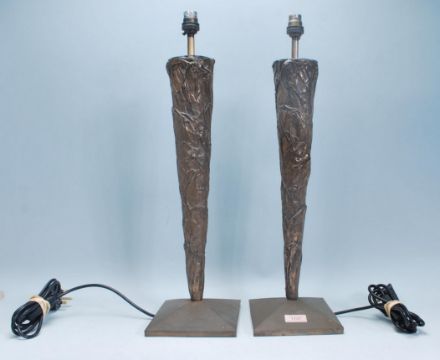A good pair of Art Deco style tall bronze effect table lamps. Each of tapering form being raised on terraced angular bases with naturalistic form. Measures 56 cm high.