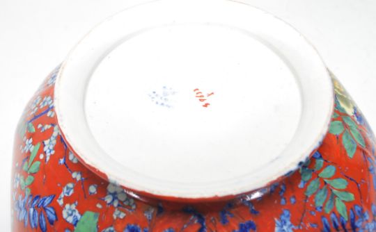 A mixed group of ceramic wares dating from the 19th Century to include a decorative ribbon plate with floral sprays and gilt rim, Staffordshire figures, Majolica plates etc, Arthur Wood bird vase, a centrepiece bowl having red ground with blue flowers. Together with a white marble figure of a child with a wave covering him sat on shells and moulded base. Tallest measures 26 cm tall.