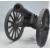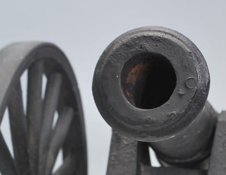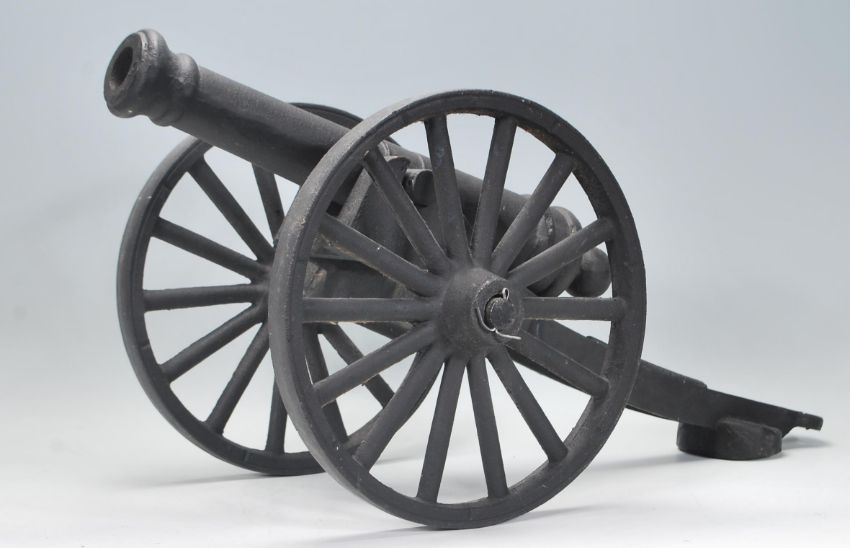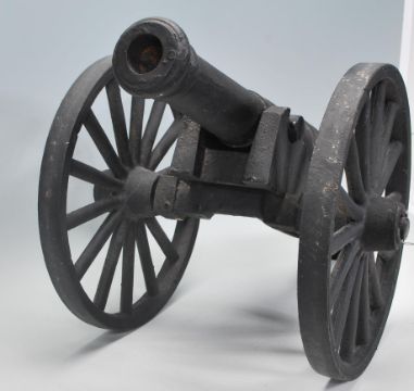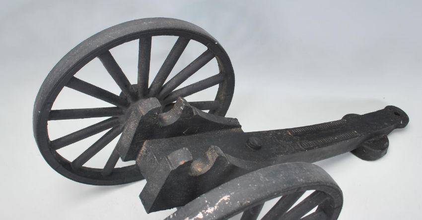 A good vintage 20th Century cast iron garden / floor standing cannon. Black painted, with shaped base and moving wheels. Measures 34 cm tall by 72 cm long.