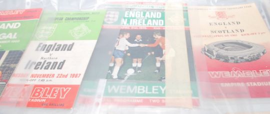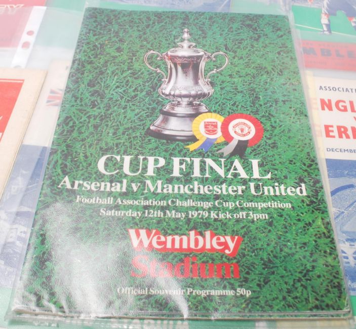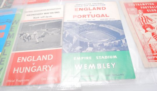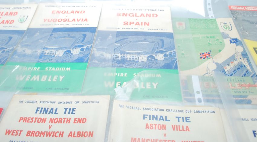 A good collection of mixed 20th Century Football Programmes from across the years. Mostly International examples with some F.A. Cup to include England v Rest Of The World 1953, England v Scotland 1955, England v Yugoslavia 1960, England v Spain 1960, England v Scotland at Wembley 1949, England v U.S.S.R. 1967, England v Bulgaria 1968 and more. F.A. Cup programmes include Arsenal V Stoke City F.A. Cup Semi-Final 1971 signed by Jerry Conway, Gordon Banks and John Marsh, Final Tie Preston v West Bromwich Albion, Final Tie Burnley v Tottenham Hotspur and more.