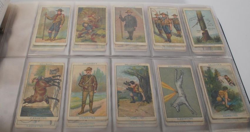 An album of vintage Gallaher cigarette trade cards. Full sets include Silk Cut Advertisements, Island Sporting Celebrities, British Birds Series of 100, The Great War Victoria Cross Heroes Series two, four, five, six, seven and eight, Beautiful Scotland, Boy Scout Series 100 Designs, Silk Flags, Scenes From The Empire, Dogs, Art Treasures of the World, Our Countryside and Coastwise.