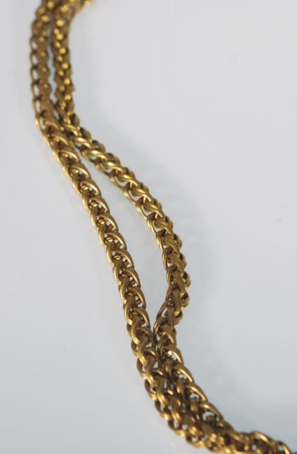 A 20th Century brass guard watch chain with woven links and a spring ring clasp. Measures: 62 inches. Weight: 55.6g.