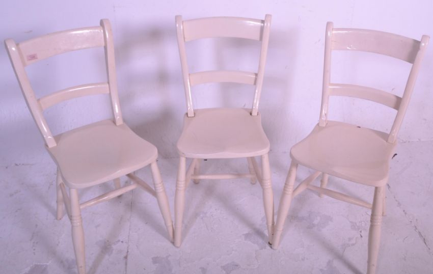 A set of 3 Victorian 19th century beech and elm wood dining chairs. Raised on turned legs with saddle seats having Oxford bar backs. Painted gloss white some time ago.  Measures 83cms x 35cms x 37cms