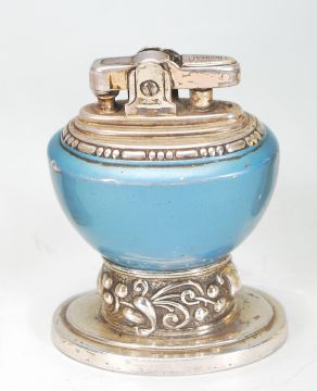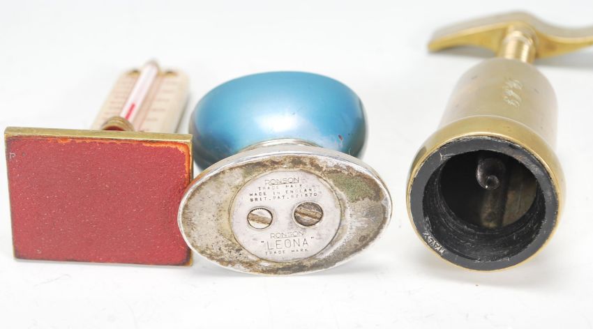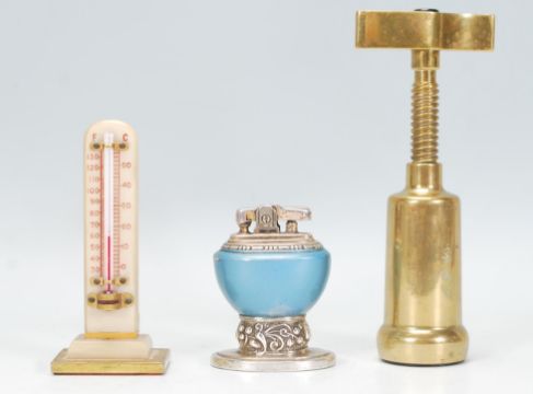 A small group of mixed items dating from the 19th Century to include a Victorian brass corkscrew / bottle opener, a Ronson Leona table lighter and a Lucite desk thermometer raised on a brass base. Corkscrew measures 15cm long.