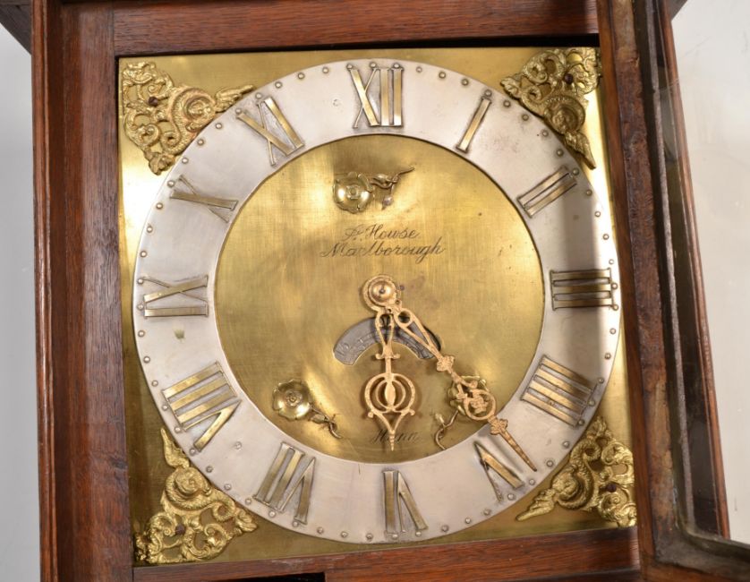 A 19th century West Country oak crossbanded brass faced longcase clock by A House of Marlborough. The brass face with silvered chapter ring, brass roman numerals having inset 30 hour movement with weights and pendulum