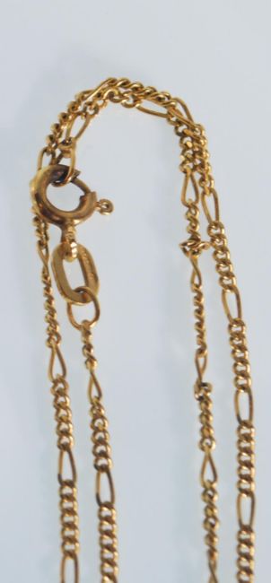 A stamped 375 9ct gold figaro link chain necklace with a 9ct gold swivel fob set with an orange faceted stone. Total weight 5.2g.