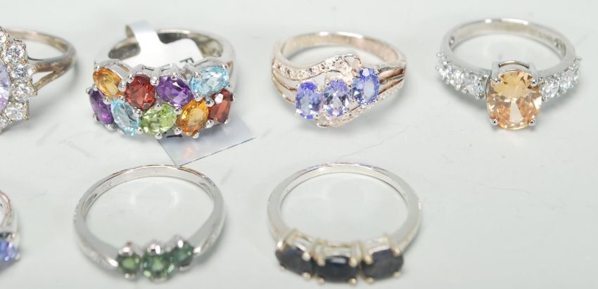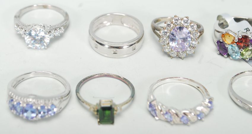 A selection of eleven silver ladies dress rings to include a ring set with three oval cut stones, a cross over ring set with three purple stones, a cluster ring set with two rows of coloured stones, a ring set with an oval cut lilac stone with a halo of white stones, etc. Total weight 32.7g. All within their original boxes.