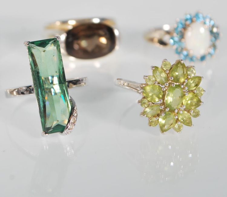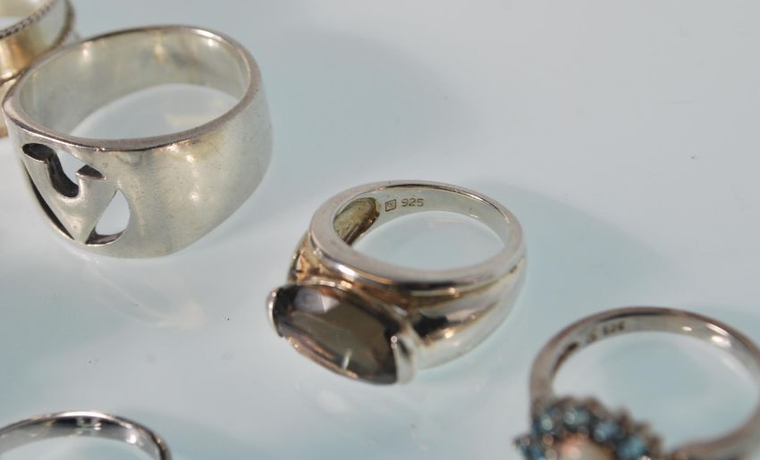 A selection of 12 Silver rings to include a silver ring with iridescent greek key design, a 925 Silver hallmarked ring with violet coloured stone inset, a 925 silver ring with a revolving star band,  a silver thumb ring with Airwalk insignia and others. Gross weight 84g.