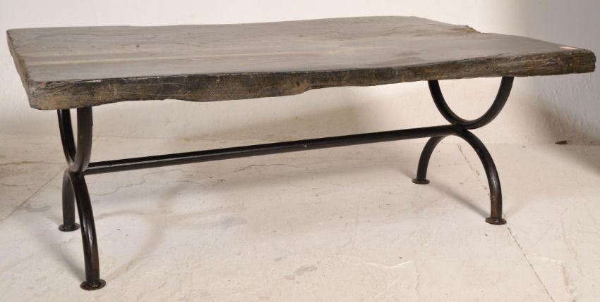 A good vintage retro 20th Century slate topped coffee table raised on a curved X frame style tubular metal base. Thick slate slab atop. Measures 46 cm high  x  115 cm wide  x  77 cm deep.