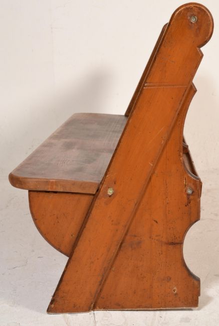 A Victorian 19th century Gothic Arts & Crafts solid oak pew bench of ecclesiastical form being raised on angled supports with bench and panelled back rest. Measures 77cm x 155cm x 50cm.