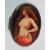 A small silver pill box in an oval shape featuring an enamelled lid. The enamel depicts a female nude who has hair to her waist and wears an orange silk for modesty. Measures: 3.7 x 2.7 cm. Weight: 19.1g.