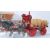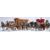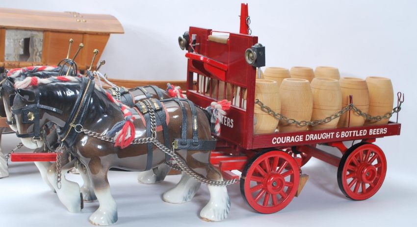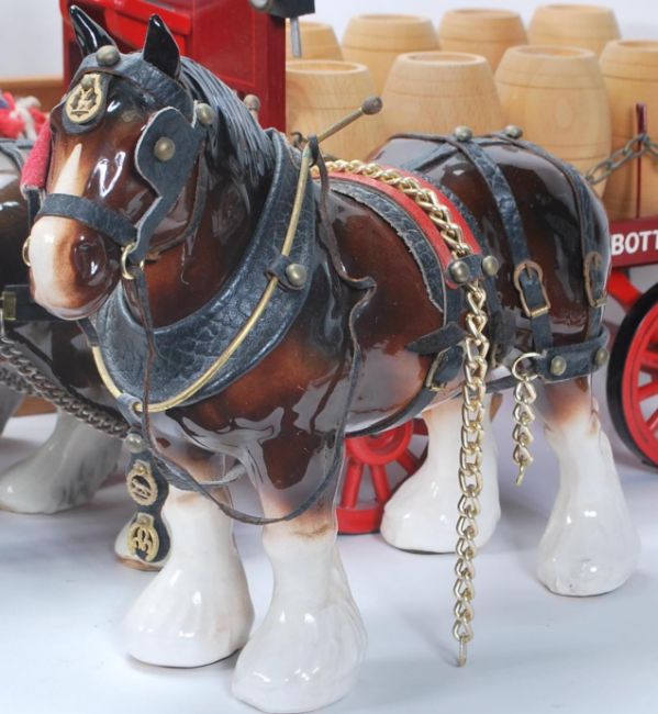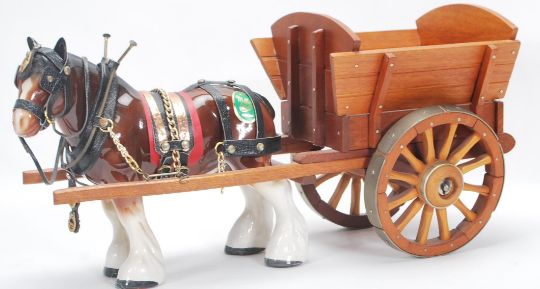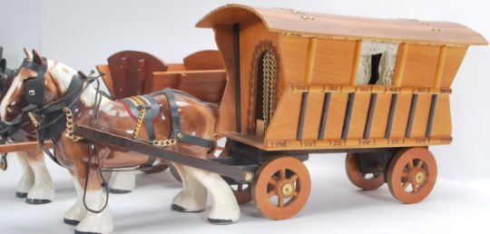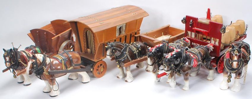 A mixed collection of vintage 20th Century horses and wagons / stagecoaches in the manner of Beswick to include a two open back waggons each drawn by a single shirehorse, double horse drawn brewery example, a single shirehorse and one pulling a gypsy waggon.