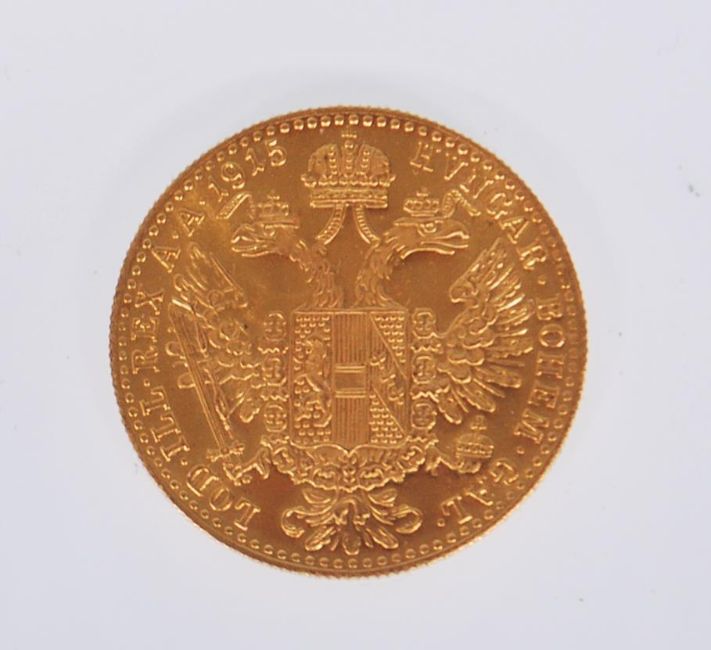An 18ct gold Austrian 1 Ducat coin (restrike) having a head facing right and coat of arms to the verso. Measures approx 20mm. Weight 3.5g.