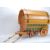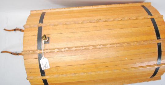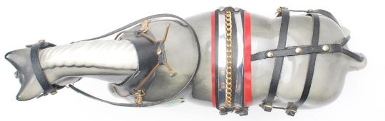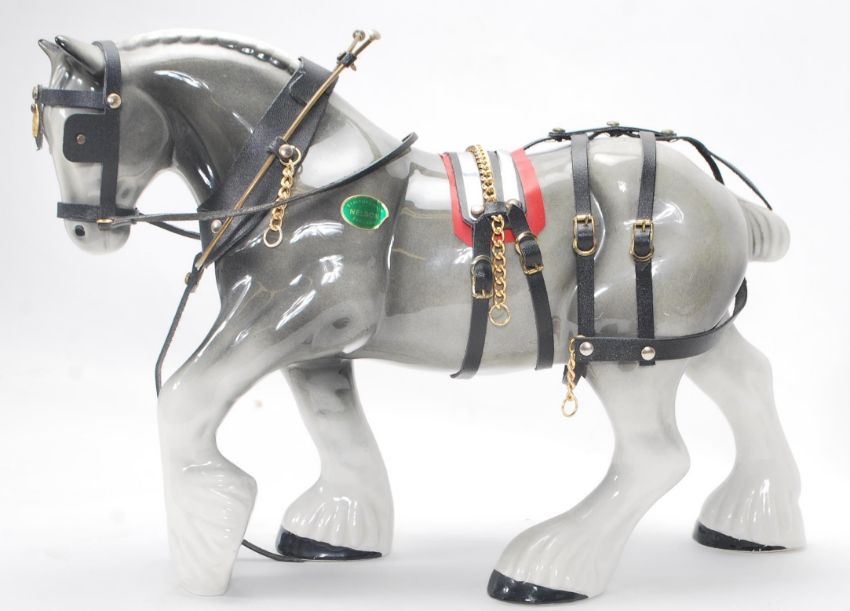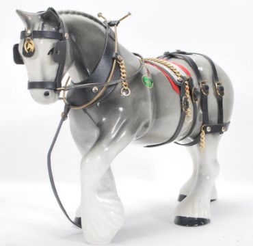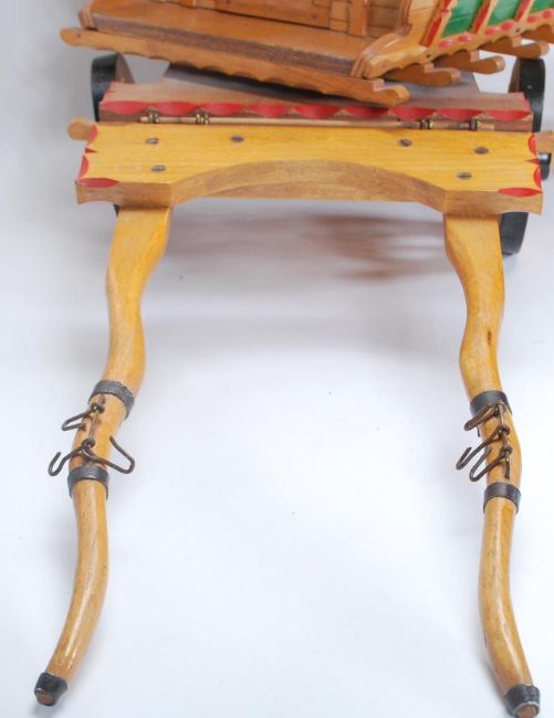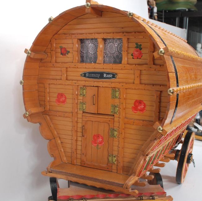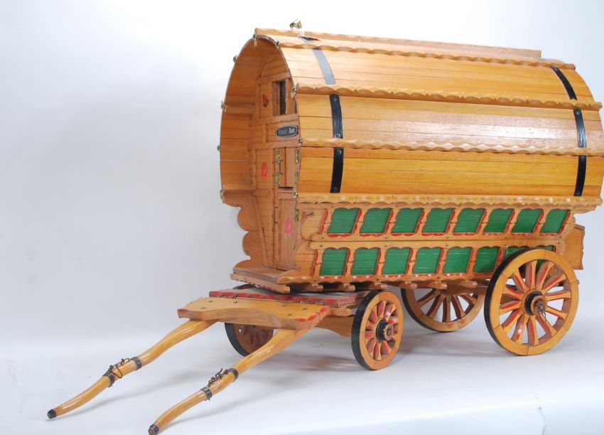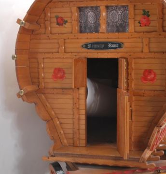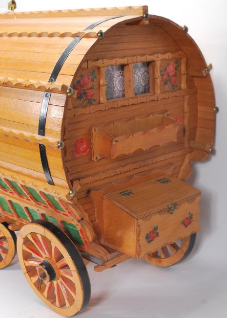 A large vintage 20th Century Gypsy Caravan and shire horse. The gypsy wagon of domed form with hand painted red and green decoration to the body and wheels with opening doors and box to back. The ceramic shire horse having leather reins with original sticker to side reading 'Nelson'. Caravan measures 43cm tall by 53cm wide.