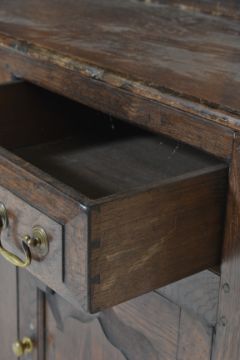 A 17th century style joined and moulded oak dresser, having two-tier open plate rack, three drawers to fielded panel doors raised on block supports. Separates into two for ease of movement.  Measures 222cm high by 142cm wide by 47cm deep.