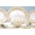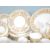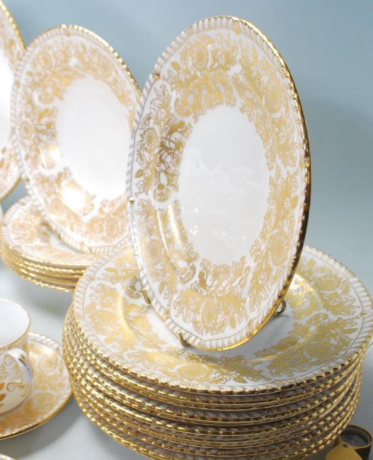 A Royal Crown Derby dinner service and tea service in the Brocade pattern having a white ground with gilt thistle pattern to the rims to include coffee pot, five dinner plates, six round dishes, twelve side plates, twelve coffee cans, an oval centrepiece plate, a cake plate, sugar bowl, 18 saucers of three sizes, two tureen lids.