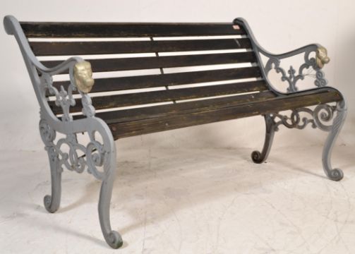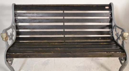 A 19th Century Victorian garden bench having cast iron sides with scrolled decoration and lions masks to the arm rests, the seat constructed from ebonised wooden planks. Measures 78 cm high  x  127 cm wide  x   75 cm deep.