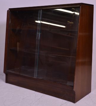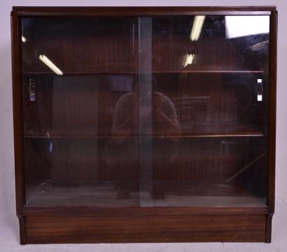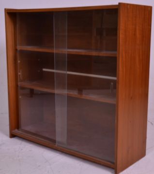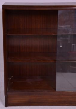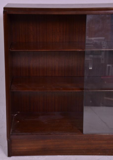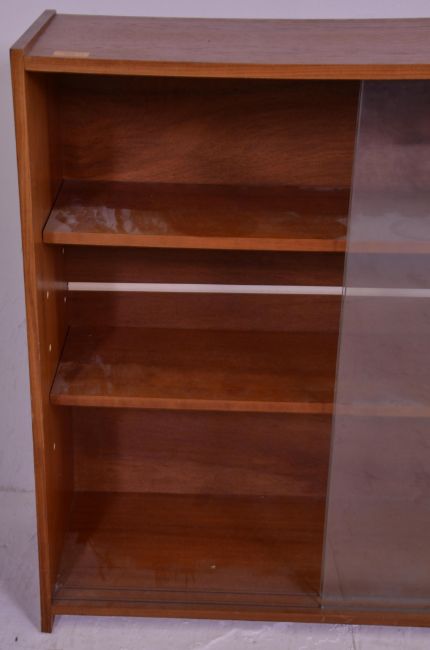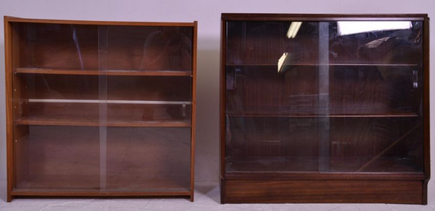 Two vintage 20th Century closed teak bookcase shelving units each having two shelves with glazed sliding cabinet drawers. One raised on a plinth base the other on turned legs. Measures 86 cm high x 92 cm wide x 35 cm deep.