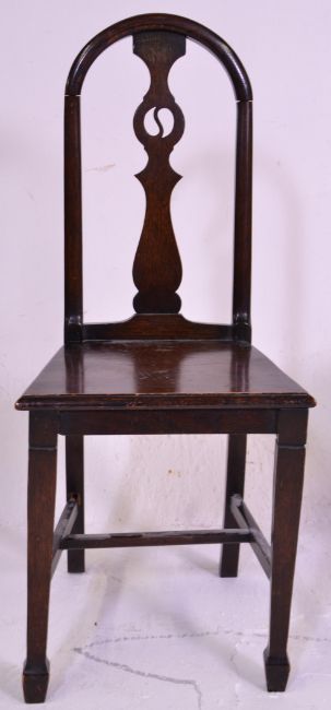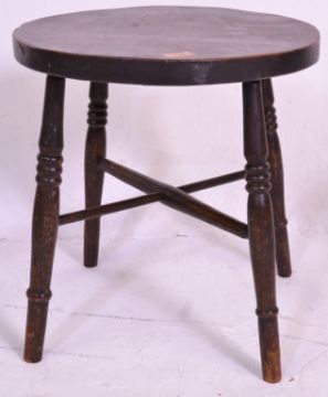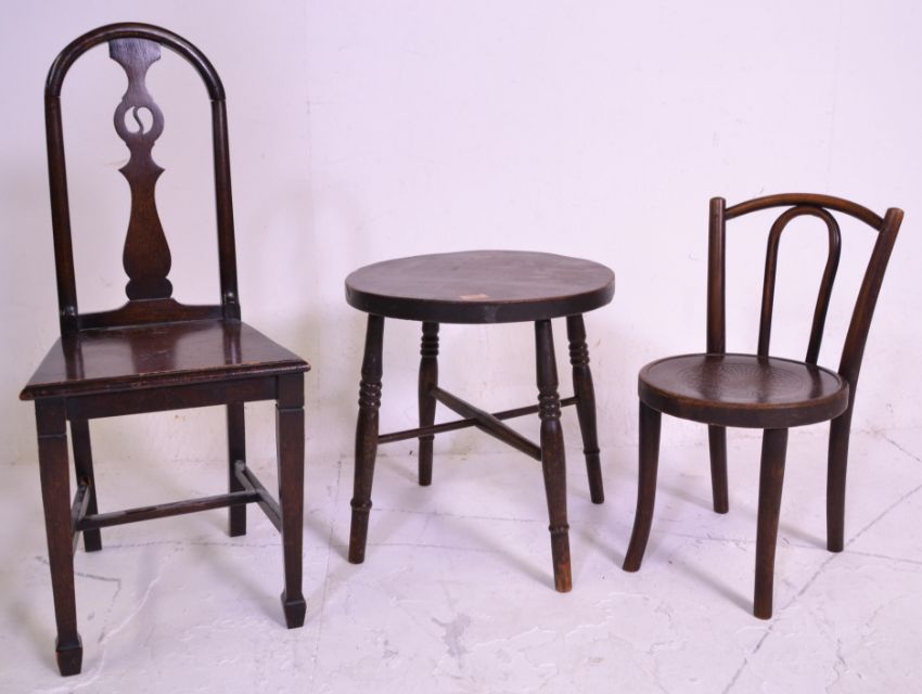 A 19th century oak childs chair of folk design being raised on squared legs with panel seat and arched back rest together with an oak and elm circular occasional table and a Thonet style cafe table raised on turned legs with bentwood back rest. Measures 86 cm high x 36 cm wide x 36 cm deep.
