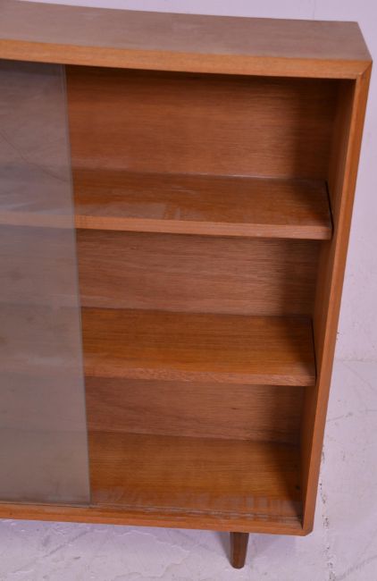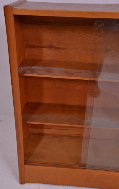 Two 20th Century freestanding closed bookshelves each having glass sliding doors with two shelves within, both raised on plinth bases, one marked for G Plan. Measures 93 cm high x 77 cm wide x 26 cm deep.