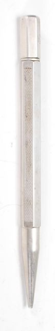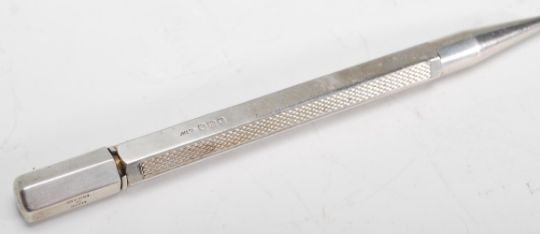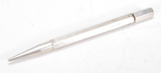A silver hallmarked propelling pencil by Johnson Matthey & Co, London assay, dating to 1946, gross weight 24.9 g. Measures 12 cm long.