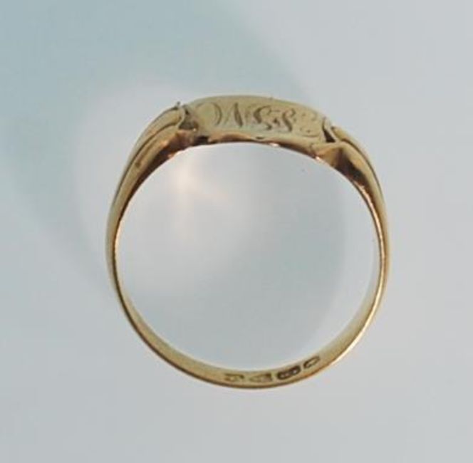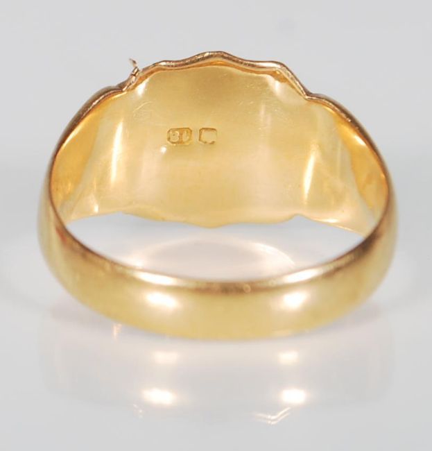 A hallmarked 18ct gold signet ring having an armorial crest to the head engraved with initials having reeded shoulders. Hallmarked Chester 1909. Weight 3.0g.