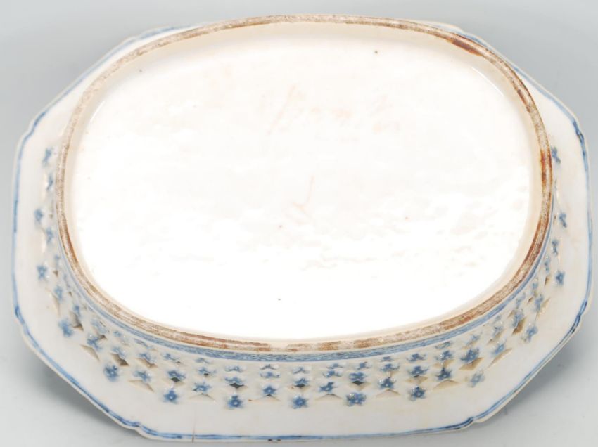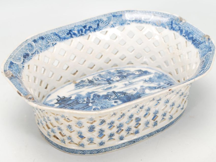 An 18th Century Chinese blue and white porcelain chestnut basket having pagoda landscape scenes painted to the base, with pierced sides and applied florals, the rims intricately painted with butterfly and scalloped patterning. Measures 7cm high x 21cm wide x 16cm deep.
