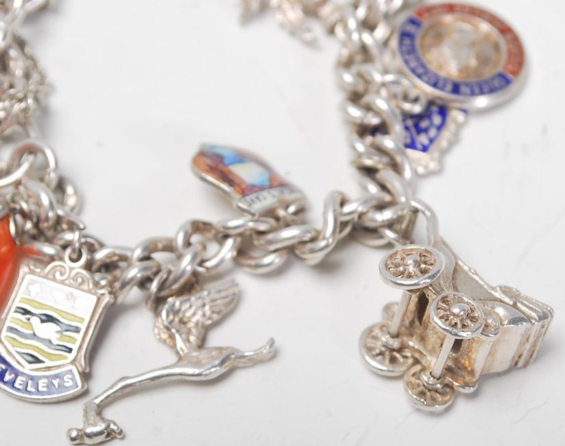 A Silver hallmarked charm bracelet having a curb link chain having 19 charms including a large silver crest/charm hallmarked Thomas Fantorini Birmingham 1944, a silver jubilee charm, a silver thistle, a silver coat of arms of Oban, a silver coat of arms of Anglesey, a flying stork carrying a baby and others all relating to Scotland. Gross weight 57g.
