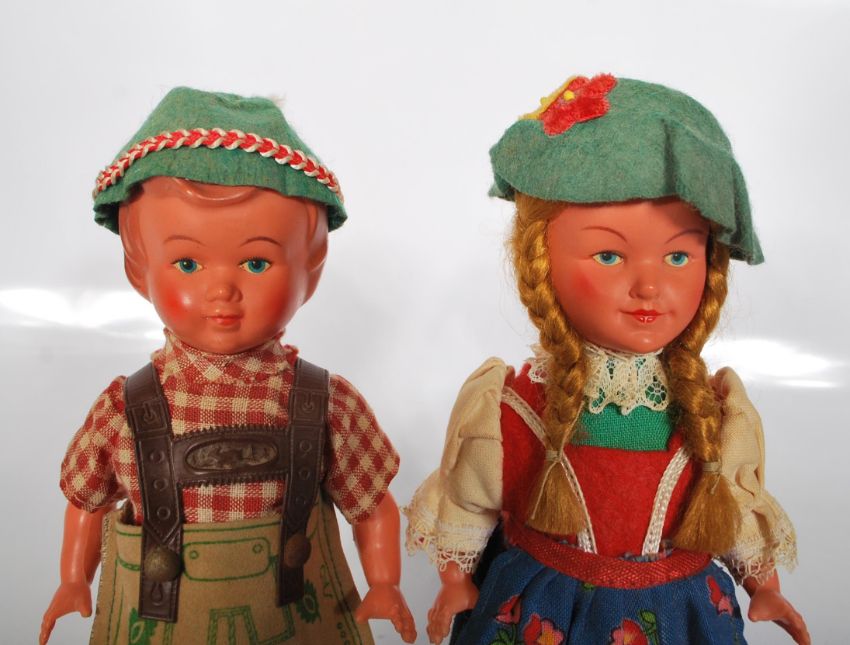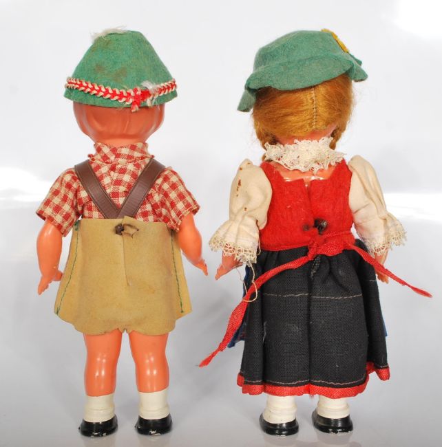 Two vintage mid 20th Century souvenir German / Austrian wind up toy dolls dressed in traditional clothes with shuffling feet. Measures 17cm tall.