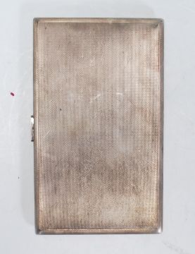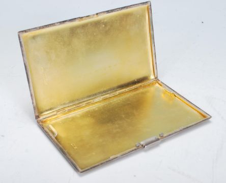 A large mid 20th Century English silver cigarette case of rectangular form having engine turned body with monogrammed cartouche and push button clasp to side with gilt interior. Hallmarked for Birmingham date letter K 1959, makers mark for W H Manton Ltd. Weighs 216.4g. Measures 14cm long 8.5cm wide.