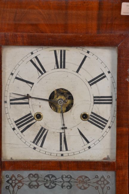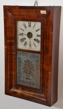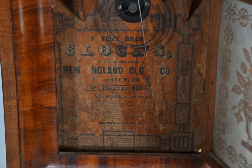 An early 20th Century American walnut wood wall clock of rectangular form having a square face to the top with a white enamelled dial with roman numerals to the chapter ring with a frosted glass window below. Interior of the case marked New England Clock Company. Measures 66 cm high  x  39 cm wide  x  11 cm deep.