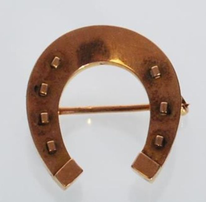A 19th Century Victorian equestrian related horse shoe brooch having raised detailing, with a hinge pin to the verso. Measures 2.5 cm. Weight 3.1g.