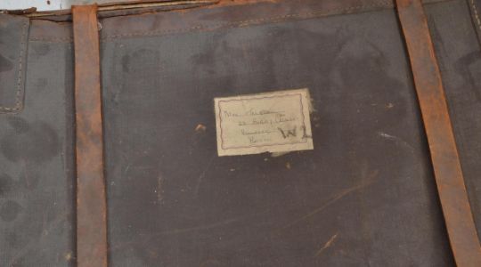 A vintage late 19th / early 20th Century military tin steamer trunk, hinged top with lock to front. The trunk with notation to the top together with a vintage 20th Century leather suitcase.  Measures 26cm by 107cm by 43cm.