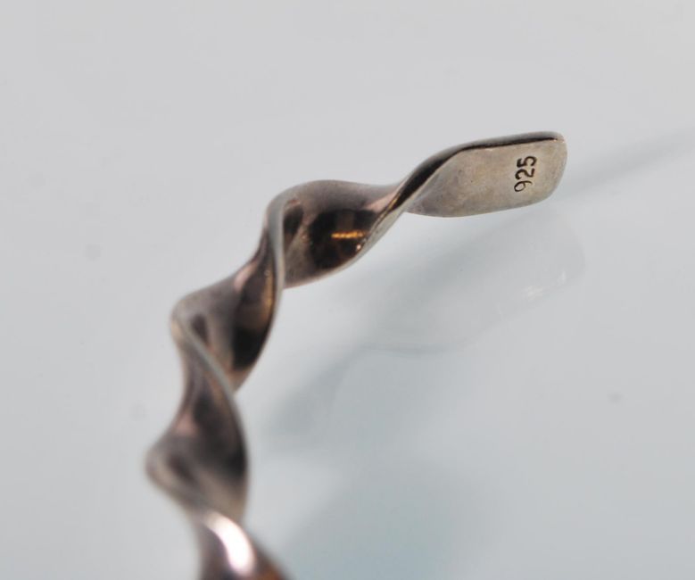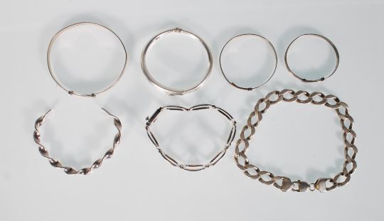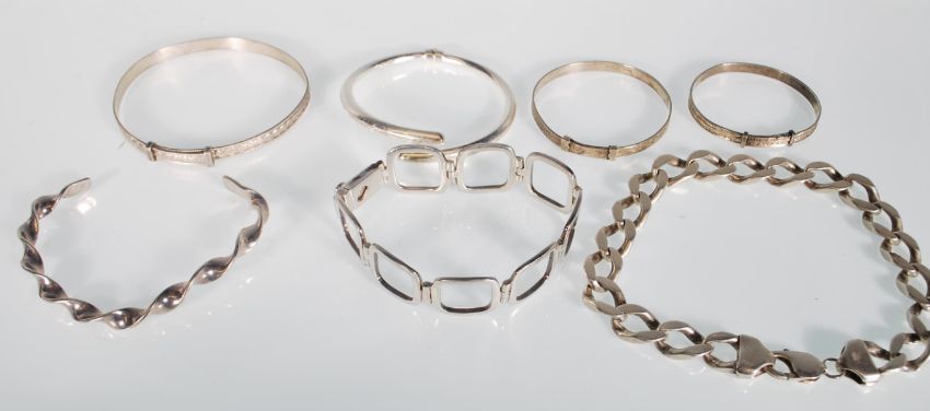 A collection of silver bracelets including a 925 silver chain bracelet, a 925 silver bracelet of twisted form, a silver hallmarked bracelet with a repeating love heart design, a 925 italian made silver hinged bracelet and others. Gross weight 126g.