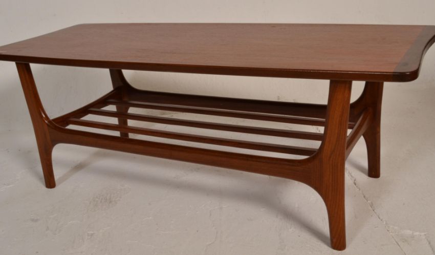 A 20th Century retro vintage teak wood coffee table having a shaped top and magazine rack bellow, all raised on tapering legs with shaped stretcher.